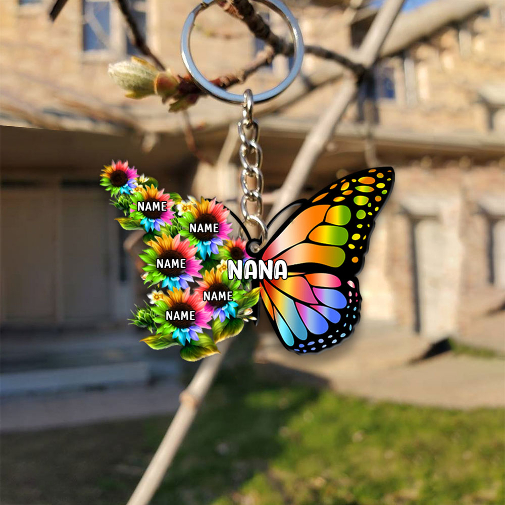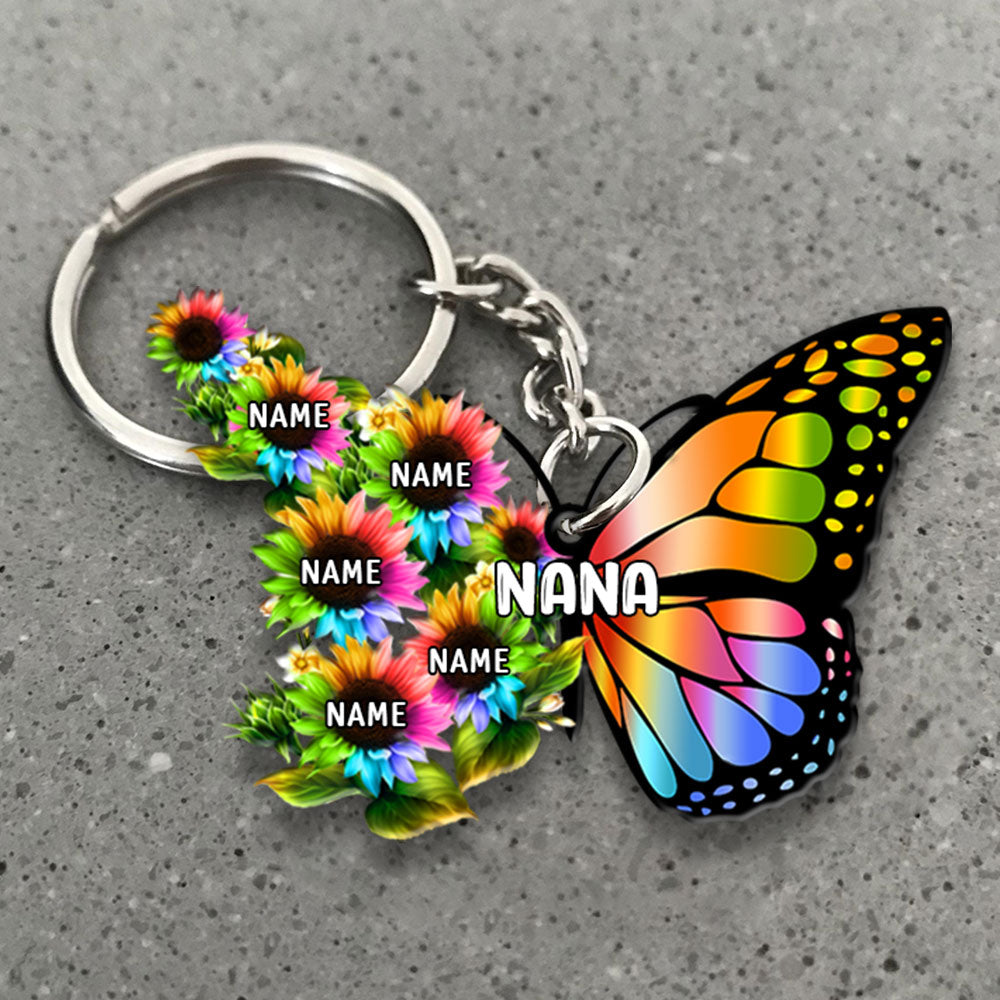 Grandma Colorful Butterfly With Sunflower Flat Acrylic Personalized Keychain For Grandma, 2 Sides Are The Same
